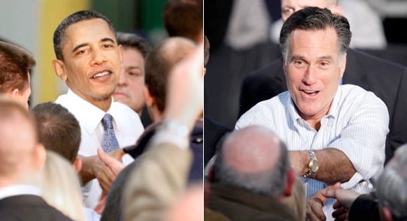 President Obama (left) and Mitt Romney (right) shaking hands with supporters at campaign events.